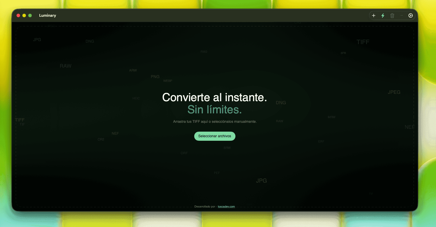 Luminary acepta archivos .TIF y .TIFF. Utiliza ImageIO y Core Image de Apple para garantizar compatibilidad máxima con cualquier perfil de color.