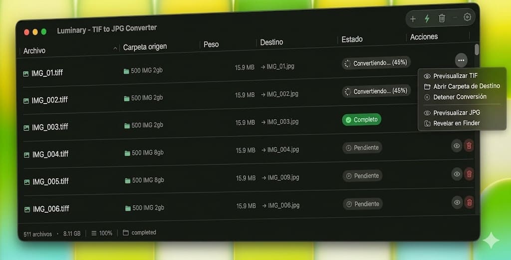 Luminary ya está disponible en el Mac App Store. Convierte miles de fotografías .TIF a .JPG con procesamiento paralelo nativo, calidad ajustable y drag & drop. 100% local, sin suscripciones.